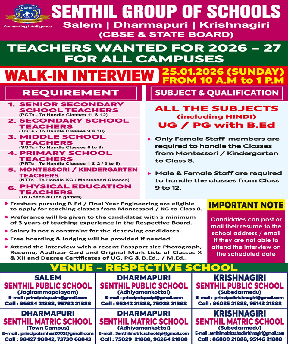 If you are interested in pursuing an opportunity to work at the Senthil Group of Schools, please apply.
