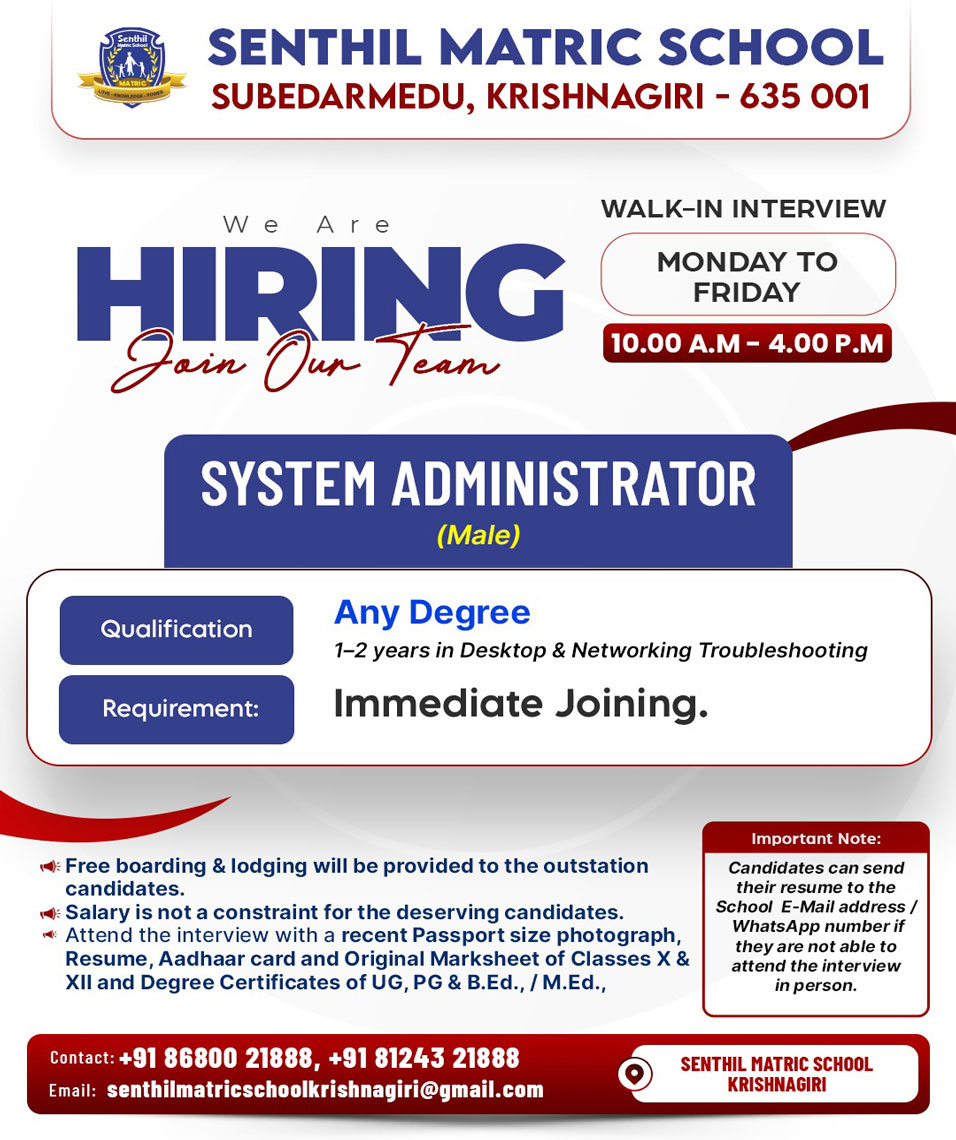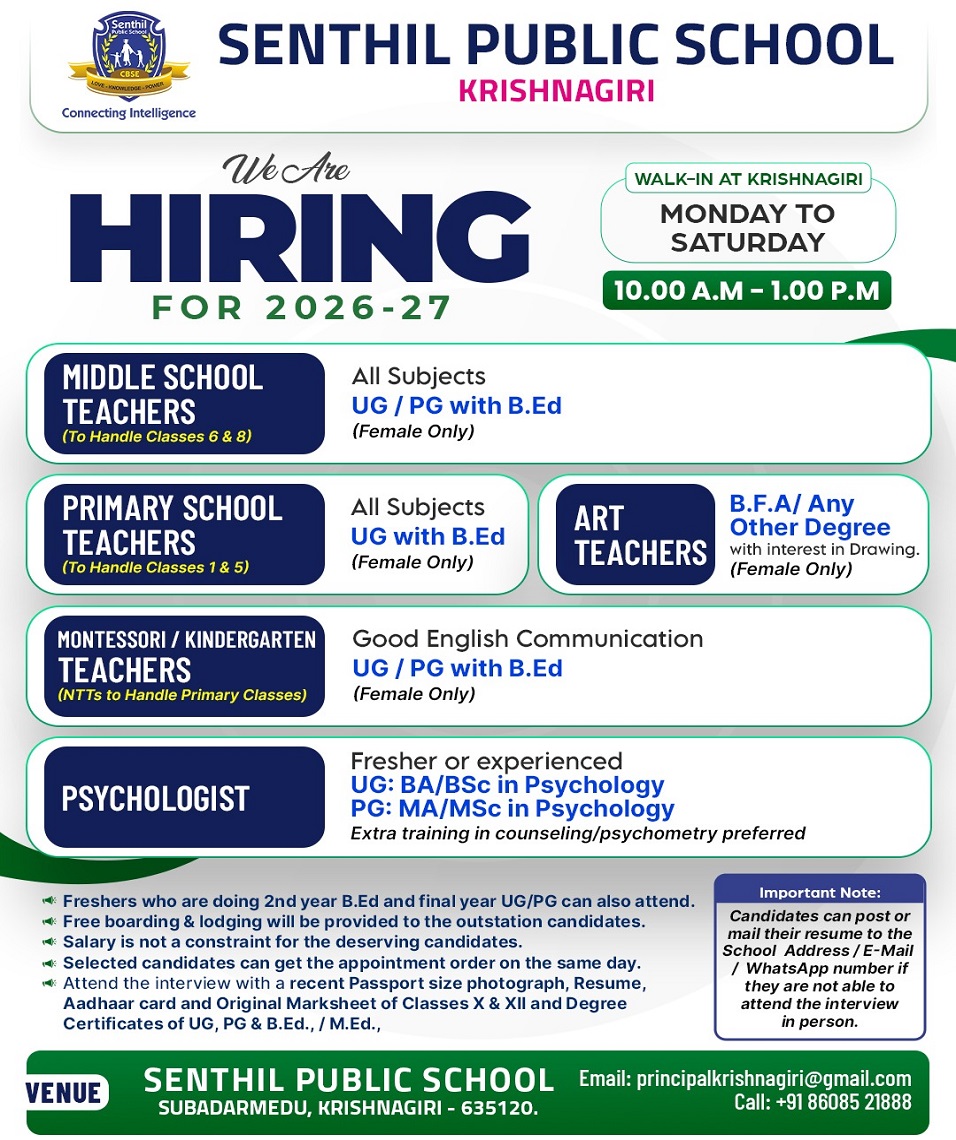 If you are interested in pursuing an opportunity to work at the Senthil Group of Schools, please apply.